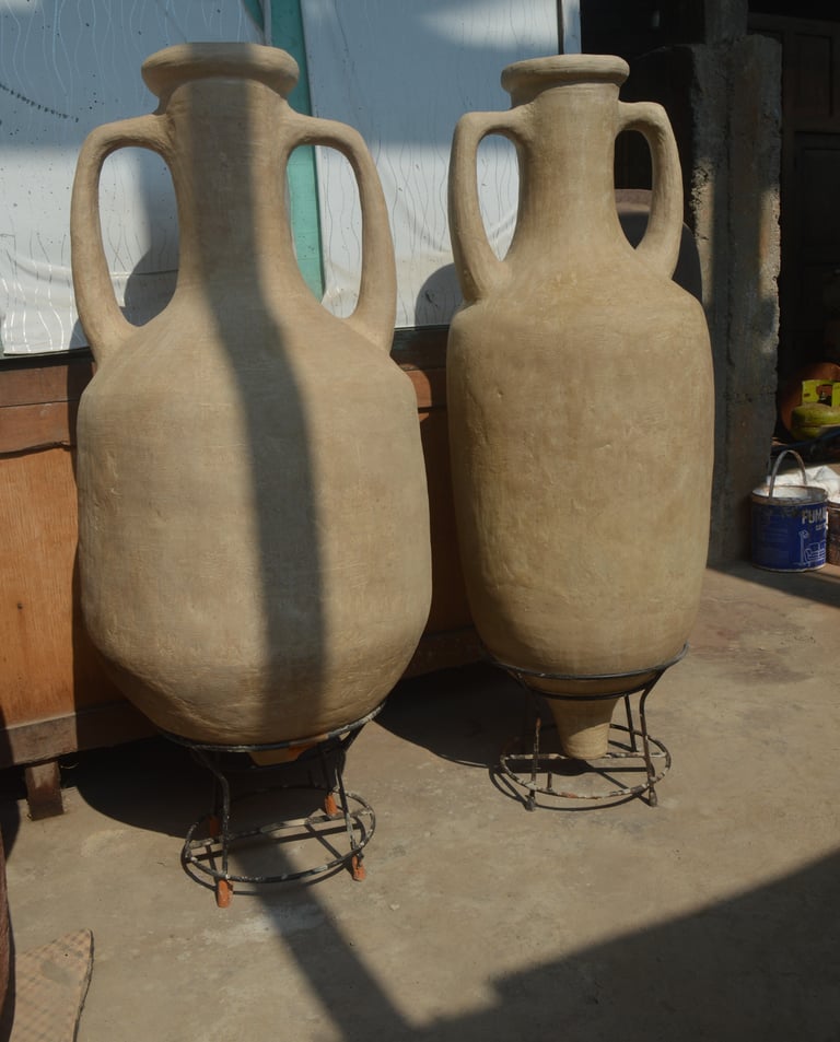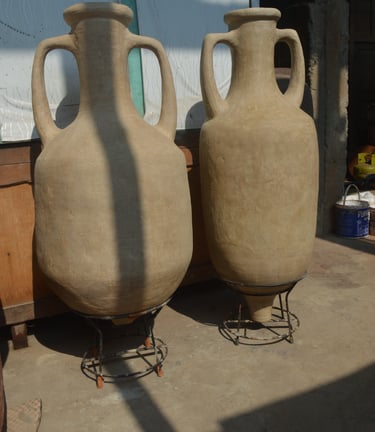 Formed by hand from the humble soil, these grand terracotta amphorae breathe the ancient rhythm of tradition. Their curves hold the memory of touch — each line, each imperfection, a whisper of the artisan’s devotion. The natural clay, sun-baked to a soft, earthen tone, speaks of time and endurance, of elements shaped by patience and fire.