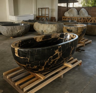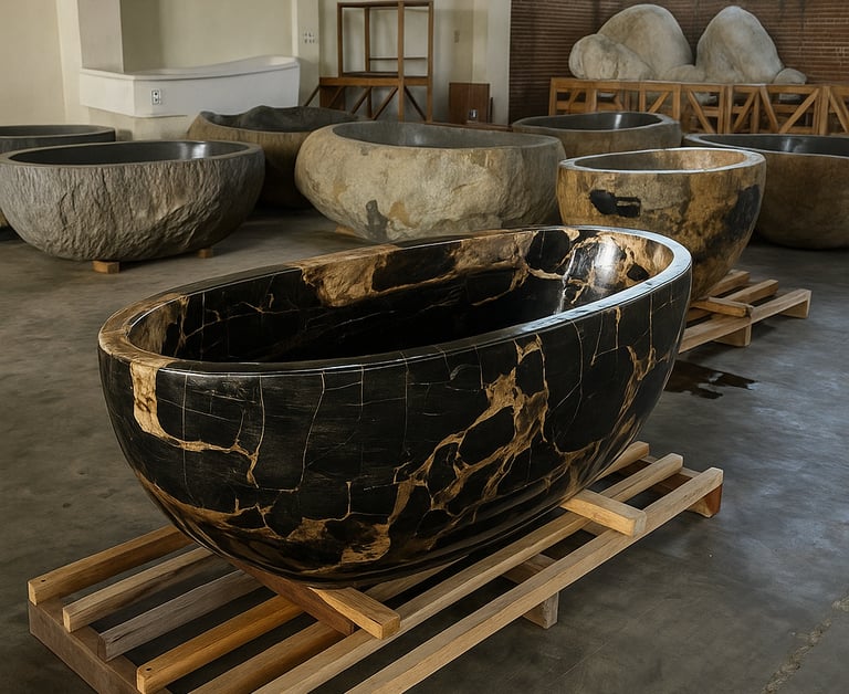 Formed from solid petrified wood, this bathtub stands as a sculptural statement of natural grandeur.
