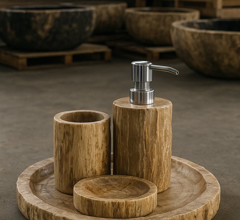 A collection of hand-carved petrified wood accessories — minimalist yet timeless.