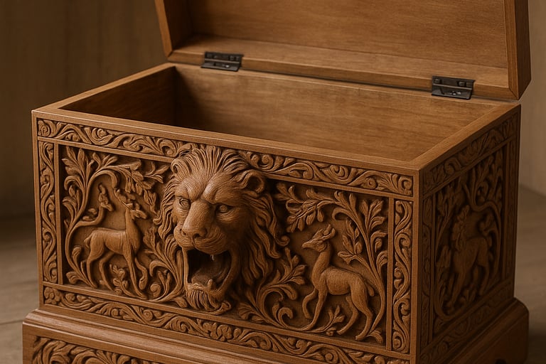 The roaring lion and forest motifs symbolize guardianship, strength, and legacy — transforming a storage object into a narrative of power and art.