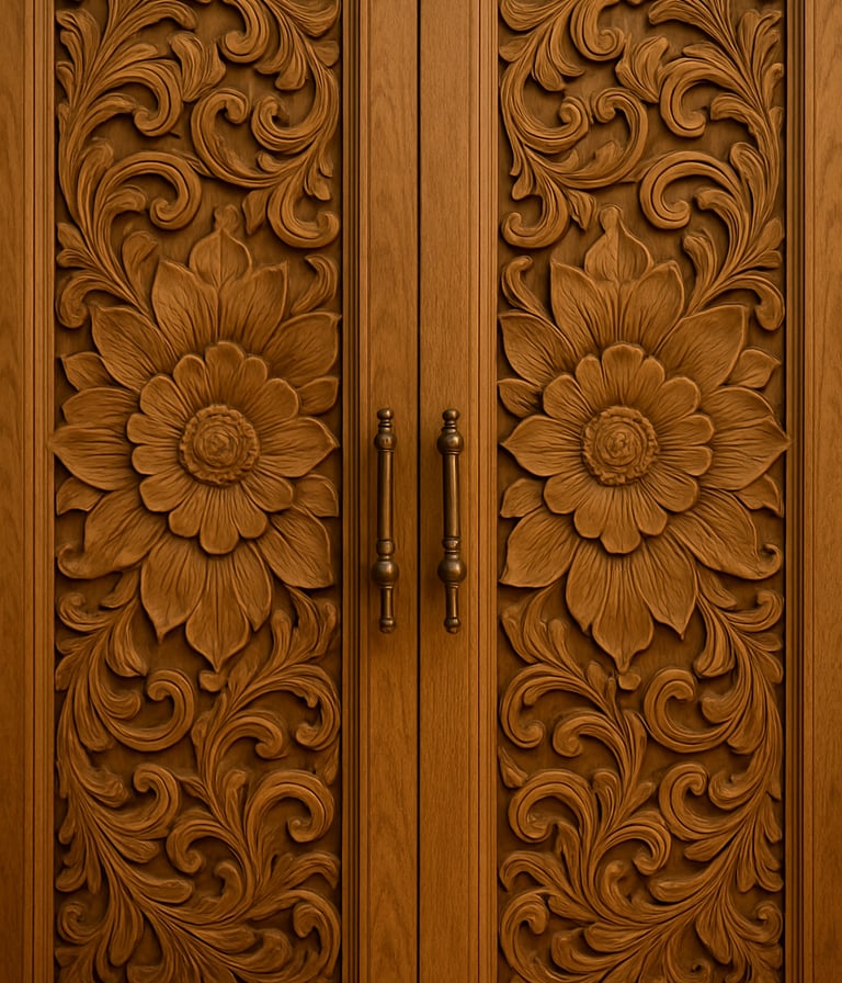 Hand-carved from solid teak, this double door features floral motifs that flow like living vines.