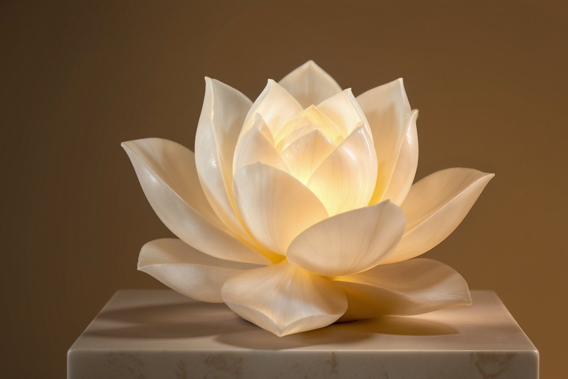 Bathed in the soft luminescence of golden onyx, Radiance of Serenity embodies grace and divine calm. The sculpture reveals a celestial figure in serene poise, her lotus held delicately as a symbol of purity and awakening.