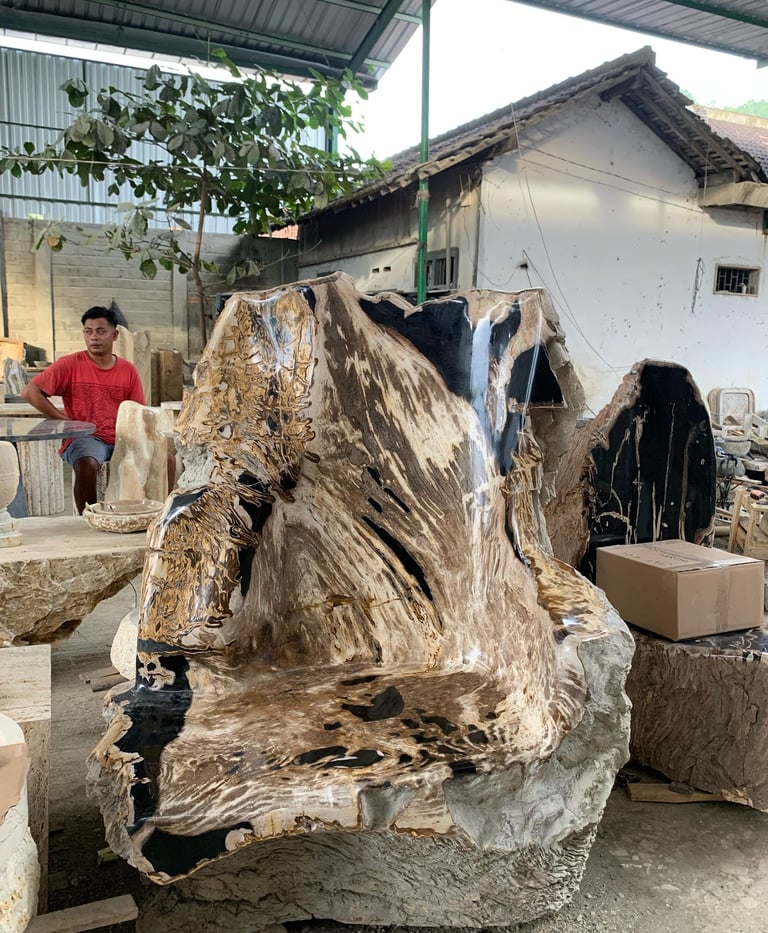 Carved not by hand but by time itself, this monumental seat of petrified wood embodies the convergence of earth’s elemental powers. Once the body of a living tree, it has endured the slow alchemy of transformation — from organic breath to mineral silence. Its flowing contours resemble molten stone, a frozen current of energy caught between creation and stillness. The glossy surface reflects the cosmos within, while its rugged edges retain the raw memory of the forest. To sit upon it is to commune with the patience of centuries — a throne born from eternity’s quiet fire.