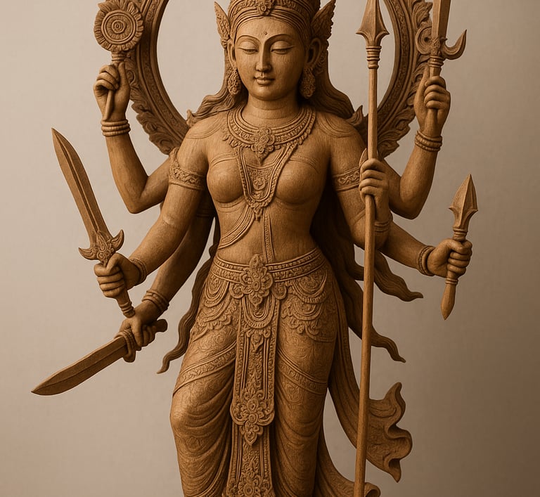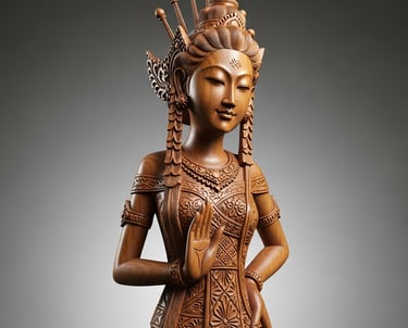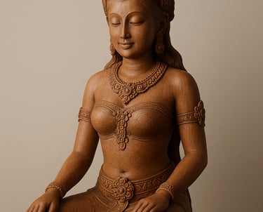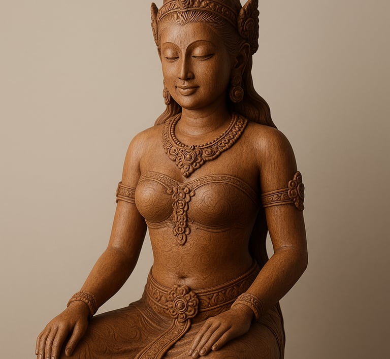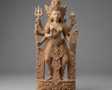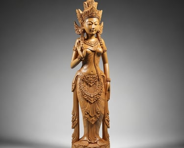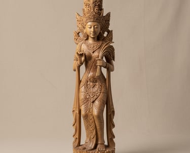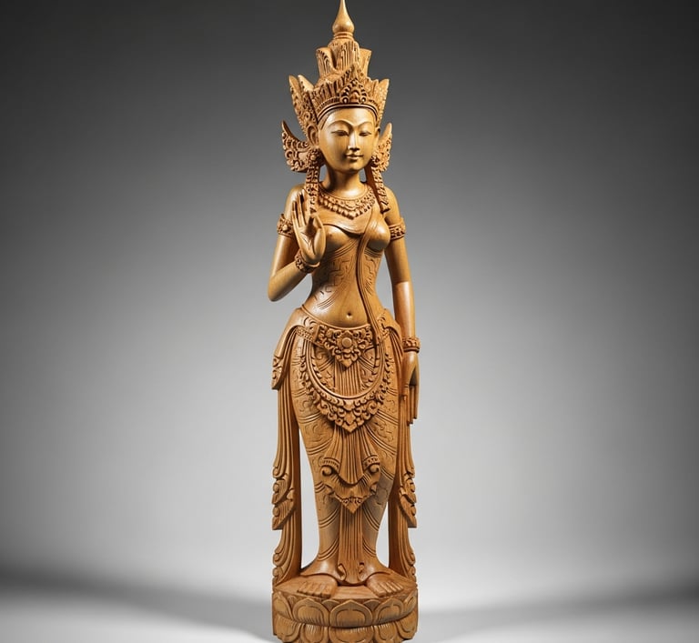 The Silent Grace embodies the stillness between breath and eternity — the tranquil poise of divine femininity carved in teak. Her gaze is lowered, yet her presence commands serenity; her form, a hymn to balance and devotion. Each curve and fold reveals a hidden language of reverence — where craftsmanship becomes prayer.