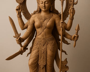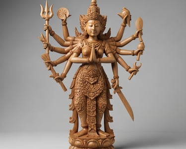 Born from ancient whispers and carved through the soul of teak, Ethereal Reverence embodies divine equilibrium — the harmony of power and grace. The figure stands upon a lotus pedestal, its posture both commanding and serene, as if channeling the unseen currents between heaven and earth. The four arms extend not in might, but in blessing, weaving silent verses of devotion into every grain of the wood.