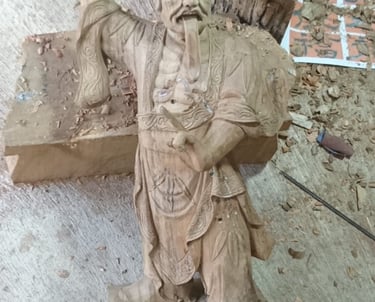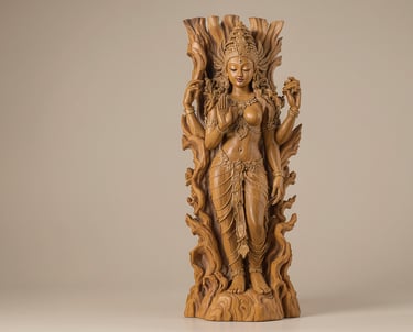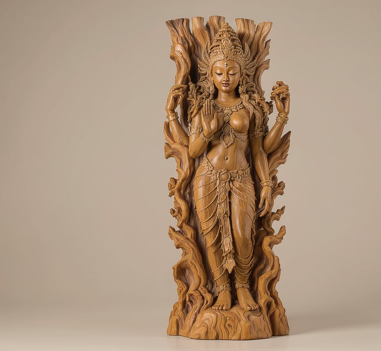 DFrom the heart of ancient teak emerges Ethereal Guardian — a vision of divine serenity sculpted from living wood. Her posture leans gently against the cradle of nature, as if born from the tree itself. Every fold of her garment and each curve of her form whisper the untold stories of devotion, beauty, and eternal stillness.
