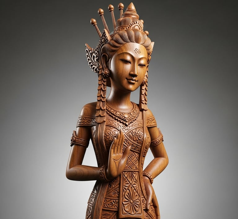 Carved from the timeless essence of teak, Serenity of Apsara embodies the stillness between divinity and motion — a moment where grace becomes eternal. Each curve is a whisper from the craftsman’s soul, unveiling beauty that transcends form. The fine grain of the teak breathes warmth, while the intricate patterns echo forgotten hymns of temples and dreams.