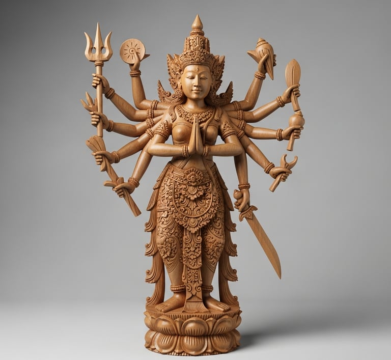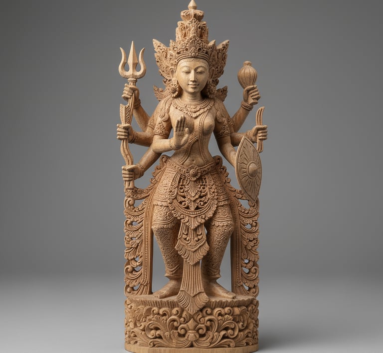 Divine Equilibrium embodies the eternal dance between creation and destruction — the serene power of balance that sustains the cosmos. Every arm, every gesture, carved from solid teak, holds a fragment of divine purpose. The artist’s hand does not merely shape wood, but awakens presence — a silent guardian that commands reverence and calm.