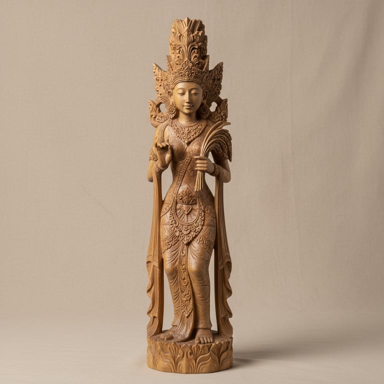 In the sacred language of wood, Sanctum of Harvest tells the story of abundance and serenity. Her gentle stance cradles the offering of nature — a tribute to the eternal rhythm between earth and spirit. Each curve of teak whispers of timeless devotion, each grain of wood holds a secret song of creation.